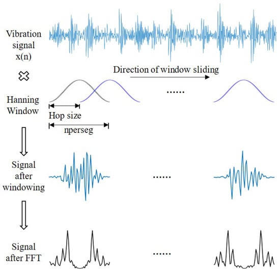 Short-time Fourier transform and wavelet transform are commonly used methods in signal processing, both of which can provide frequency domain and time domain information of signals and are methods for analyzing non-stationary signals. Wavelet transform is more suitable for dealing with local features of non-stationary signals, but its results are affected by the selection of wavelet bases, which requires a certain amount of experience []. The STFT is relatively easy to explain and implement. Therefore, the short-time Fourier transform is a more suitable signal analysis method for non-stationary signals such as bearing vibration signals. The process of the short-time Fourier transform is to divide the signals into multiple time periods so that the signals in each time period can be regarded as stationary signals, and then, the signals in each time period can be Fourier transformed to obtain the frequency domain information in each time period, so that the frequency domain information and time domain information of the signals can be obtained. The process of the short-time Fourier transform is shown in Figure 1.