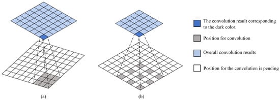 To understand the implementation process of dilated convolution more intuitively, the receptive field diagram of dilated convolution under different dilated rates is shown in Figure 2. Among them, in Figure 2a, the dilation rate was set to 1, and its implementation process was consistent with ordinary convolution; in Figure 2b, the dilation rate was set to 2.