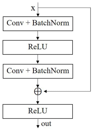 A residual network is a deep convolutional neural network that enables the network to learn complex features more easily by using residual modules to learn cross-layer mappings. The problems of vanishing and exploding gradients are avoided []. The basic idea of the residual block is that, in the process of transmitting information, the network can skip some layers and directly pass the input to the subsequent layer, keeping the original information unchanged and performing subsequent processing, thus avoiding the loss or disappearance of information. This method allows the residual network to be trained at a deeper level, improving the performance and effectiveness of the network. The schematic diagram of the residual module is shown in Figure 3, and its definition is as follows:
