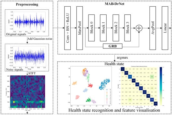In practical applications, the collected vibration signals are usually inevitably superimposed with a large amount of noises, which will lead to the deterioration of the feature extraction and learning ability of the convolutional neural network, thereby affecting the accuracy of bearing fault diagnosis. To solve this problem, we propose a bearing fault diagnosis method based on a short-time Fourier transform and MAB-DrNet, and the overall architecture diagram is shown in Figure 4. The proposed approach comprises two main components: data preprocessing and the classification model MAB-DrNet. In the data preprocessing stage, we employed an acceleration sensor to collect vibration signals, which were then transformed into a time–frequency representation known as the time–frequency diagram. This conversion technique enabled us to represent the one-dimensional time-series signals in a two-dimensional format that effectively captures the signal characteristics. By analyzing the signals in both the time and frequency domains, we can more accurately extract fault-related features, thus enhancing the diagnostic accuracy. The classification model, MAB-DrNet, played a crucial role in our approach. It leverages the benefits of attention mechanisms and deep residual networks to effectively capture complex patterns and correlations within the transformed signals. The MAB-DrNet model was designed to learn discriminative representations from the time–frequency diagrams and perform accurate classification of various fault types.