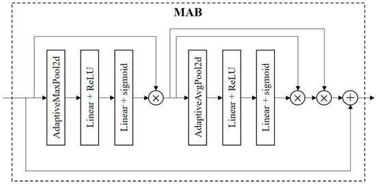 The structure of the MAB block is shown in Figure 6. The design of our proposed MAB block drew on the ideas of the squeeze-and-excitation (SE) attention ResNet [] developed for improving the performance of image recognition tasks. The SE module enhances the feature channels with important information by learning the importance of each feature channel, thus improving the performance of the model. The MAB block builds on the SE block and is used to find a balance between computational efficiency and accuracy.
