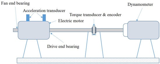 The Case Western Reserve University (CWRU) dataset [] was chosen as the data for our experiments to validate the effectiveness of the proposed model. The data acquisition device consisted mainly of an electric motor, a torque transducer, and a dynamometers, as shown in Figure 7. With a motor horsepower of 2HP, the single-point fault was placed on the bearing (SKF6205) by EDM machining techniques, and the original vibration signals were obtained by the acceleration transducer laid on the bearing. The bearing state types included four states: normal state, inner ring fault, outer ring fault, and rolling element fault located between the inner and outer rings. Each fault type was classified as 0.007 inches, 0.014 inches, and 0.021 inches by artificial processing damage. Ten bearing conditions were selected in this paper, as shown in Table 2. We chose the drive end accelerometer data with a sampling frequency of 12 kHz and mixed the bearing data of four loads of 0 hp (1797 rps), 1 hp (1772 rps), 2 hp (1750 rps), and 3 hp (1730 rps) as the object of our experiment, to increase the diversity of data and improve the generalization ability of the model. Among them, we set the length of each signal sample to 1024 for non-overlapping sampling. We divided 80% of the samples in order as the training dataset and 20% of the signal samples as the test dataset.