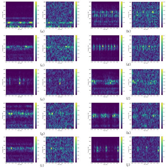 Figure 8 shows the comparison of the time domain diagrams of 10 kinds of bearing health statuses before and after adding Gaussian white noise with a signal-to-noise ratio of −4 dB to the original signals, where the horizontal axis represents the sampling time and the vertical axis represents the amplitude. It can be seen from the figure that the characteristics of the signals were submerged after adding noise, which will greatly increase the difficulty of fault diagnosis. Therefore, we converted the bearing vibration signals with noise into a time–frequency diagram through a short-time Fourier transform and analyzed the signals of different frequency bands through the combination of frequency domain decomposition and time domain decomposition, so that it is easier to find fault modes and features. At the same time, the short-time Fourier transform has an anti-interference ability and can perform localized analysis on the signals in the two dimensions of the time domain and frequency domain, reduce the influence of noise, and improve the accuracy and reliability of fault diagnosis. Therefore, the time–frequency diagram obtained by the short-time Fourier transform can analyze and diagnose the bearing vibration signals more comprehensively, eliminate or reduce the influence of noise interference, and improve the accuracy and efficiency of fault diagnosis. Figure 9 shows the time–frequency diagram of the tested bearing under the condition of Gaussian white noise with a signal-to-noise ratio of −4 dB. Before training and testing, the pixel values of all images were fixed between [0, 1], so in the experiment, the time–frequency diagram is a grey-scale diagram, and here, the RGB image is shown for clear observation.