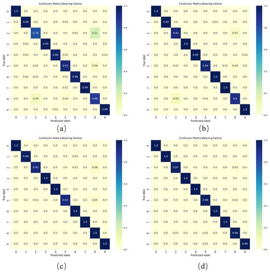 Next, we constructed a confusion matrix, as shown in Figure 10; we can intuitively reflect the classification performance of the model on different categories of data by constructing the confusion matrix, which can help us evaluate the classification effect of the algorithm more clearly. Specifically, the confusion matrix shows the correspondence between the predicted results of the classifier on each category and the actual labels, such as true positives, false positives, true negatives, false negatives, etc. For example, at 0 dB, Fault Type 2 was mistakenly classified as Fault Type 8, Fault Type 5 mistakenly classified as Fault Type 8, etc., indicating that the diagnosis of these two types was still difficult.
