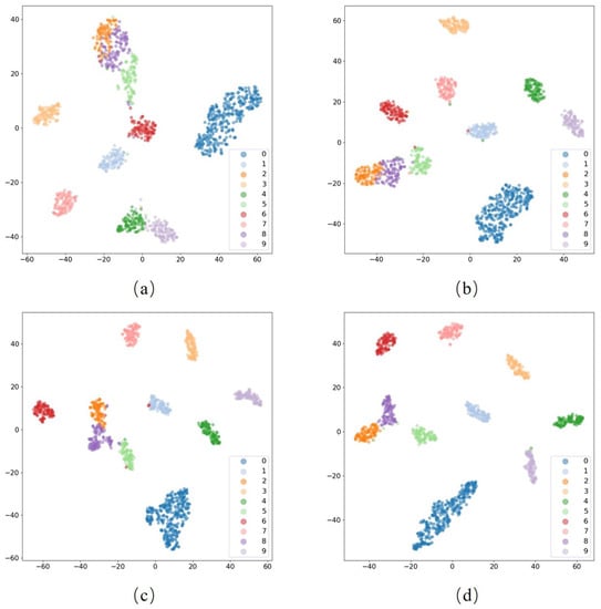 Visualization of the t-SNE of the proposed algorithm, where: (a) −6 dB; (b) −4 dB; (c) −2 dB; (d) 0 dB.
