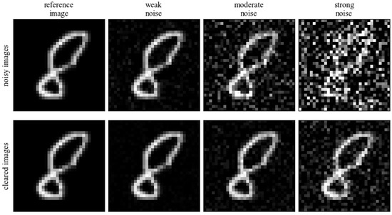 On such a divided dataset, we conducted research on the impact of noise on the quality of the processed data. Based on the visual assessment of image degeneration, we selected three levels of Gaussian noise: weak, medium, and strong. For the selected noise levels, the Noisy data were modeled using the sigma parameter (values of 0.1, 0.15 and 0.85 were chosen, respectively as weak, median, and strong noise). The Cleared images were also created as images with reduced noise level (values of 0.01, 0.015, and 0.085). This kind of images represents the less noisy examples, which can be trained in pairs with their Noisy versions. Importantly, during the training of the network, the new noise was inputted in each learning iteration in order to increase the size of the training set as much as possible. Examples of Noisy and Cleared images in relation to the original image are shown in Figure 2.