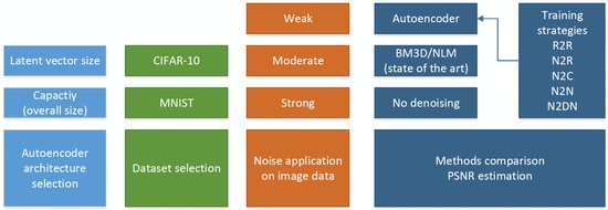 The flow chart of the experiment is given in Figure 3. We wanted to highlight the range and variety of included parameters and aspects (architectures, datasets, and noise levels). In the comparison of methods, we highlighted the crucial elements such as the various training approaches of the autoencoder, as well as a comparison with the current state of the art and with the images not treated by any denoising technique. The flow chart should be useful for a better understanding of the consecutive parts of our experiment.