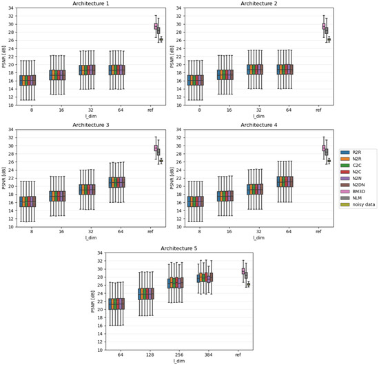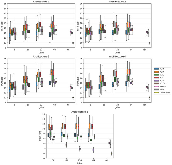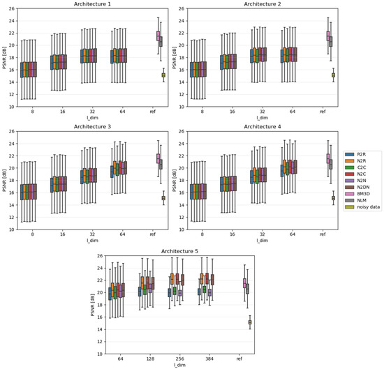 Due to the fact that the impact of individual algorithms was examined on the entire data sets, the results were presented in the form of boxplots. Boxplots are good at displaying the scatter of data around specific values. The edges of the box indicate the first and third quartiles, the crossbar indicates the average value of the set, and all the accepted resulting values are between the ends of the whiskers. The whiskers extend to points that lie within 1.5 IQRs (the interquartile range) of the lower and upper quartiles. All results that fall outside this range are outliers and rejected from the graph. In each of the graphs, the Y-axis describes the PSNR values in dB, and the X-axis divides the results into different latent dimension values, as well as a reference group that consists of three components: the results for the BM3D and NLM algorithms and, most importantly, the raw PSNR values for the Noisy test set.