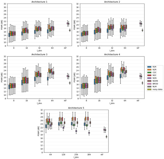 Network performance tests were carried out for five different architectures characterized by different numbers of channels (feature maps) in convolutional layers and thus a different number of all parameters. During the fine-tuning of the sizes of the used auto-encoders, we decided to test the smallest networks possible. This allowed us to fully assess the complexity of the problem and the noise reduction capabilities of each learning approach. Therefore, we made architectures 1 and 2 very small and architectures 3 and 4 slightly larger but still relatively small. Moreover, we used them to test how their performance would be affected when one small layer was added, that is, whether only the overall number of parameters is important or the number of individual layers as well. To compare their efficiency with a larger network, we implemented architecture 5, which is much larger than the others.