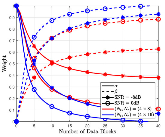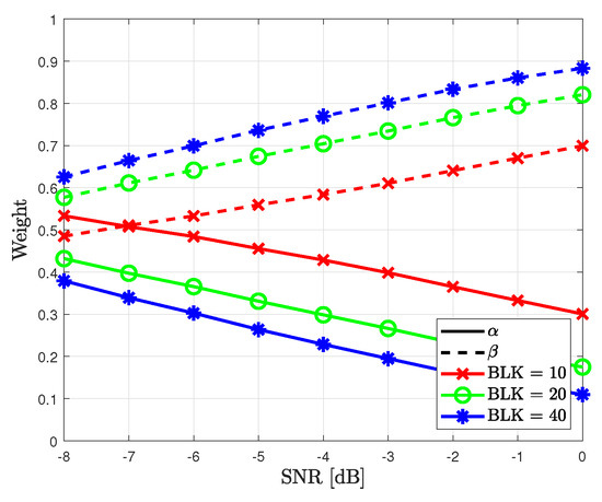 The performance of the proposed method depends on the number of antennas used. To verify the effect of the number of antennas, the proposed method was simulated based on the number of transmit antennas . As shown in Figure 8, the weight for the data-based likelihood probability was higher when was used compared with when was used. This is because increasing the number of receive antennas improves the reliability of the detected data symbols. Thus, the accuracy of the data-based likelihood probability increases. Because the optimal weights for the proposed method differs from the system parameters, various values of the weights are saved in memory based on the system environment. Subsequently, based on the system input parameters, the weights are used to the combine pilot- and data-based likelihood probabilities.