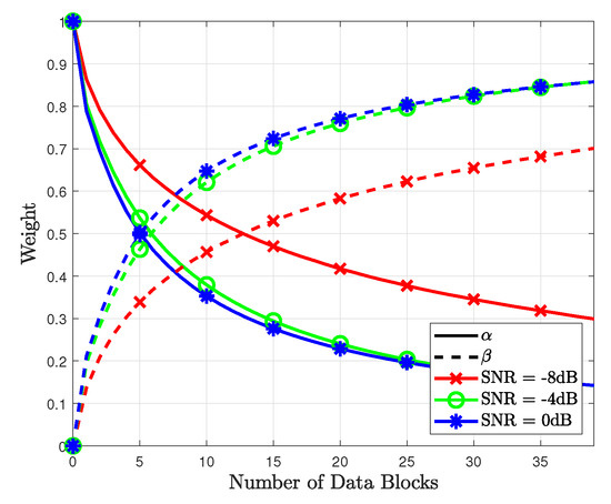 In Figure 3, the combined weights for the proposed method are shown based on d. As the number of data blocks increases, the accuracy of the data-based likelihood probability increases. Thus, the weight for the data-based likelihood probability increases, whereas the weight for the pilot-based likelihood probability decreases. The sum of weights remains as approximately 1 as the number of data blocks increases. In addition, when the SNR increases, the convergence speed increases because the correctly detected data symbols improve the accuracy of the data-based likelihood probability. Thus, the weight of the data-based likelihood probability has a higher value than that at a lower SNR. The combined weights for the proposed method were simulated based on the SNR, as shown in Figure 4. As shown in this figure, the weight for the data-based likelihood probability increases with the SNR. Compared with Figure 3, the slope of the weights in Figure 4 increases linearly with the SNR.