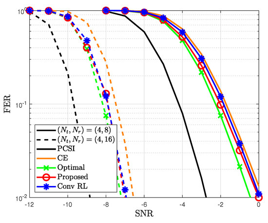 The FERs for different detection methods are illustrated in Figure 7 to demonstrate the effectiveness of the proposed method. First, to achieve an FER of at antennas, the proposed method exhibited an SNR gain of approximately 0.2 and 0.3 dB compared to conventional RL and CE methods, respectively. In addition, the FER of the proposed method was similar to that of the optimal case. This is attributed to the fact that the proposed method improves the likelihood probability toward the optimal likelihood probability. Second, the FER decreases as the number of receive antennas increases. All the detection methods show an improvement in FER due to the diversity gain associated with a large number of receive antennas. In particular, at 4 antennas, the proposed method showed an SNR gain of approximately 0.2 dB compared to CE method, while achieving a similar FER to the conventional RL. Note that the proposed method can obtain the weights more easily than the conventional RL.