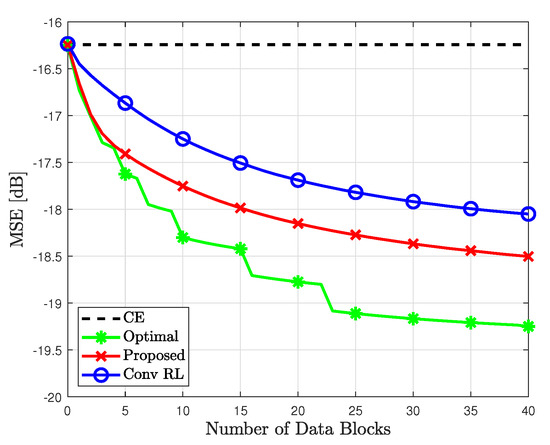 Figure 8 shows the MSE between the true and estimated likelihood probabilities, i.e., for MIMO systems. First, the proposed method achieved a lower MSE than the conventional RL. In particular, to achieve an MSE of dB, the proposed method requires approximately 15 number of data blocks, while the conventional RL requires approximately 35 number of data blocks. This indicates that the proposed method achieves more accurate likelihood probability with fewer data blocks. Moreover, the MSE of the proposed method approached that of the optimal case. This is because the proposed method determines weights to minimize the expected MSE between the true and estimated likelihood probabilities. Note that the slope of the optimal case was not smoothed because of the resolution limitation of exhaustive search.