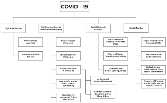 In [38], the authors conducted a study for the identification of those hot topics which were posted on Twitter related to the COVID-19 pandemic. A set of tools, such as Twitter API, PostgreSQL database, and Tweepy Python library, were used to collect the words by searching them with predefined special keywords, such as “Corona”, “COVID-19”, and “virus”. Data were collected from 2 February 2020 to 15 March 2020 to conduct the research. Secondly, the authors utilized an ML algorithm named latent Dirichlet allocation to model the obtained articles. Thirdly a sentiment analysis was also performed to obtain the total number of likes, followers, and retweets for each article. The final result of this study showed that out of 2.8 million total tweets, there were 167,073 tweets posted by 160,829 Twitter unique users. A total of 12 COVID-19-related articles were identified and then these articles were categorized according to the origin, source, impact, and steps on how to combat the virus.