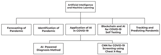 In the last few years, AI is facilitating human lives. It is playing an important role in almost every field. Most recently, AI is battling very well against COVID-19 in areas such as identification of disease, prevention from disease, and future prediction of disease [22]. There are a lot of applications of AI that are being used to prevent novel coronavirus. In the section on AI, we will provide detail about the various applications of AI that are serving against COVID-19. Furthermore, we will also discuss how AI is used to identify diseases and how it is being used to prevent coronavirus disease. Moreover, we will briefly write about ML and DL techniques, such as chest X-rays screening, imaging data acquisitions, segmentation, and diagnosis for COVID-19 [23].
