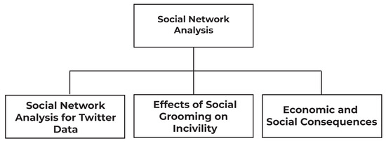 SNA is a method for exploring social structures by using networks and graph theory. In this section of our survey, we will discuss SNA techniques to analyze COVID-19 pandemic data, such as SNA of Twitter data as shown in the taxonomy. Twitter is a well-known social media application and is considered one of the most useful resources for complex social data analysis [24]. In the same section, we will also explain the effects of social grooming on incivility during coronavirus outbreaks. We will discuss mental health and how people show their thoughts on COVID-19 [25].