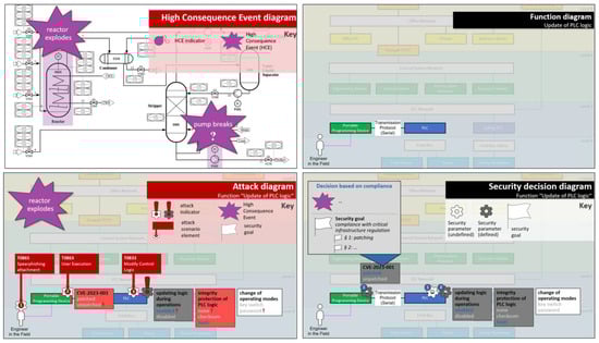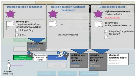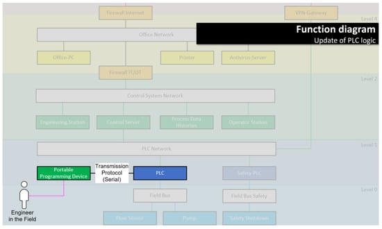 - Risk-driven decision making (marked red in Figure 1): For risk-driven decision making, it can make sense to define High-Consequence Events (HCEs)—events that would make for a really bad day at the organization and that must be prevented [10,55]. In addition, all kinds of attack scenarios potentially leading to HCEs are a meaningful addition to the security decision base because they provide more detailed indicators on how to prevent HCEs. Attack scenarios can be function-specific, detailing how a specific function may be exploited to cause a specific HCE.Security parameters contain some built-in guidance for constructing attack scenarios: parameter values that may be used in an attack are marked as attack indicators in the library. See Section 3.2 for details.Attack diagrams provide guidance by overlaying all relevant information for modeling attack scenarios onto function diagrams. See Section 3.3 for details.Example: For the same chemical production plant, a HCE could be “reactor explodes”. For the function “update of PLC logic”, an imaginable attack scenario would be sending a spearphishing attachment to a PLC engineer to gain access to her programming device, exploit a vulnerability allowing user execution on that device, and ultimately modify the PLC’s logic to cause overpressure in the reactor.