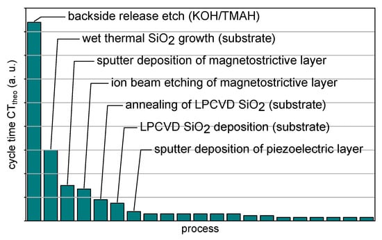 In Figure 1, the estimated theoretical process cycle times for a single material unit () on the fabrication flow outlined above are plotted in descending order. The seven processes with the longest cycle times are identified and labeled. The wet chemical etching to release the poly-Si layer from the bulk substrate has by far the highest cycle time. Oxide growth, deposition and annealing to prepare the poly-Si substrates are processes with high cycle times as well. However, these processes allow large batch sizes, such that increasing the batch size under consideration would mitigate their impact. In contrast, the sputter deposition of magnetostrictive and piezoelectric functional layers as well as the dry etching process to structure the magnetostrictive layer are single-wafer processes. Their impact is independent of the batch size, and the analysis motivates keeping them in mind.