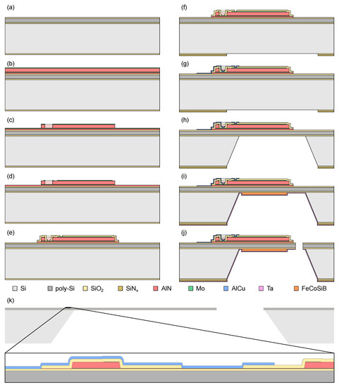 Schematic cross-sections illustrating the process flow developed to fabricate ME sensors: (a) polished Si substrate with poly-Si layer, (b) deposition of piezoelectric layer stack, (c) structuring of the AlN layer, (d) structuring of the electrodes, (e) deposition and structuring of isolation layer, (f) preparation of hard mask for back side release, (g) deposition and structuring of contact metal, (h) back side release of poly-Si layer, (i) deposition and structuring of magnetostrictive layer, (j) definition of cantilever structure etching the poly-Si layer. For comparison, (k) shows a simulated cross-section of a 7 mm die in the final state with the inset focusing on the bottom electrode contact. Colors refer to the different materials, as indicated in the legend.