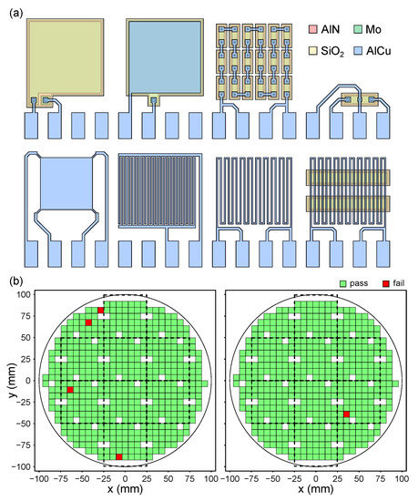 (a) Plan view layout of exemplary test structures employed in the ME sensor fabrication process; see Appendix B for a detailed description. (b) Characterization results of the intermediate 100% measurement of electrical structures on 200 mm wafers to educate further processing on 50 mm square substrates indicated by dashed lines.