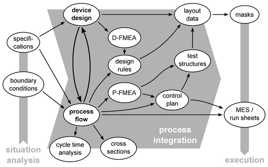 Ideas for necessary or favorable changes can be sparked anytime in the development process: for example, when attempting a critical process step for the first time or analyzing the results of the first finished devices. As significant cost is associated with processing material, it is worthwhile trying to evaluate and implement as many of these changes during initial process integration before starting the execution. This is the first-time-right fabrication objective pursued in design for manufacturing and strongly motivates the use of D- and P-FMEA methods. To not lose clarity of the dependencies shown in Figure 4, the possible iteration loops have been omitted. They can be considered leading to separate instances of the sketched workflow, restarting at the first item affected by the change.