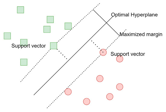 Support vector machines [22,23] are classifiers, which find an optimal hyperplane to separate classes in a high-dimensional space based on given examples (as we can see in Figure 2). An optimal hyperplane is designated after finding maximized margins based on given samples.