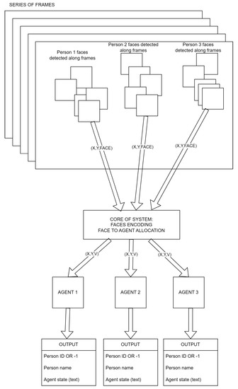 Figure 3 presents the system’s core operation. Faces from 3 persons are detected along a subsequent frame, then face images and positions are sent to the core of the system which encodes these face images and allocates them to a proper agent which is tracking this person as was described earlier. Each active agent generates some outputs for each frame, where the face assigned to the agent exists. The outputs for each agent are the following: person ID (or if a face is not recognized yet after it appears), person name and current agent state in the form of text (for instance, “Novelty detection” or “Training person 105” etc.).