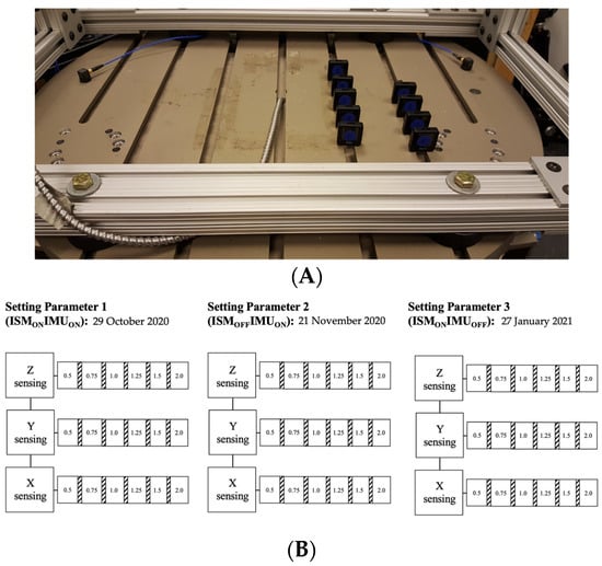To compare the effect of setting parameters and frequency, two-way repeated measurement ANOVAs were conducted for the X, Y and Z sensing axes to determine the effect of the ISM and IMU interaction at each frequency. In case Mauchly’s test of sphericity was violated, the Greenhouse-Geisser estimates of sphericity were used to correct for the degrees of freedom. Bonferroni adjustments were used for the pairwise comparisons where appropriate. The statistical analyses were conducted using IBM SPSS (Version 26; IBM Corp, Armonk, NY, USA). A p-value of less than 0.05 was considered statistically significant and the necessary assumption tests were performed.