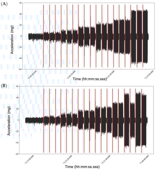Following data collection, the raw data from the ActiGraph monitors were downloaded using the ActiLife software (ActiGraph, version 6.13.4; Pensacola, FL, USA; firmware version 1.7.2) and exported to timestamped .csv files. A computer code was developed in Python (version 3.7.0, Python Software Foundation, https://www.python.org/, accessed on 1 September 2022) using the SciPy [18], Pandas [19] and NumPy [20] libraries was developed. First, any ambient high-frequency noise that the primary GT9X accelerometer may have collected was removed using a low pass fourth-order Butterworth filter (filter cut-off frequency: 15 Hz). Subsequently, the signal bias resulting from acceleration due to gravity and its orientation on the robot was removed by taking the mean value of the unperturbed trial collected at the start of each testing session and axes and subtracting it from the data collected during each of the oscillation trials to isolate for acceleration due to movement. The outcome variables that were compared included the minimum, maximum and range of the outputs during each of the tested frequencies, and were captured and calculated for comparison purposes. The maximum and minimum values obtained during each measurement period reflect the maximum accelerometer outputs obtained in the positive and negative direction, with respect to how the ActiGraph monitors axes are defined. These measures can be used to provide context and comparisons to studies that have measured the low amplitude movement of humans, such as sedentary and stationary behavior [15,16]. As a composite measure, the range of accelerometer outputs was used to reflect the minimum and maximum values produced for each measurement period. Prior to the calculation of these outcome measures, the first and last 15 s of each trial were excluded to ensure that the robot had reached a steady state and that the data quantified by the accelerometers were reliable. After verifying that no obvious data outliers were present across the three trials (via visual inspection), an aggregated (average across the three trials) value for the maximum, minimum and range of outputs was derived for each device at each frequency, setting and axes.