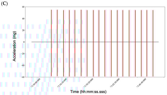Figure 2. X-axis sensing testing block for Setting Parameter 1 (ISMONIMUON; (A)), 2 (ISMOFFIMUON; (B)) and 3 (ISMONIMUOFF; (C)). Depicted are three 1-min trials, with 15 s of no movement in between trials (indicated by the red lines) collected at frequencies: 0.5, 0.75, 1.0, 1.25, 1.5 and 2.0 Hz. Note that one of the 1-min trials that took place for the 1.5 Hz testing occurred following the first 2.0 Hz trial for Setting 2.