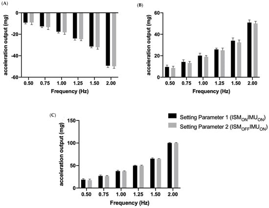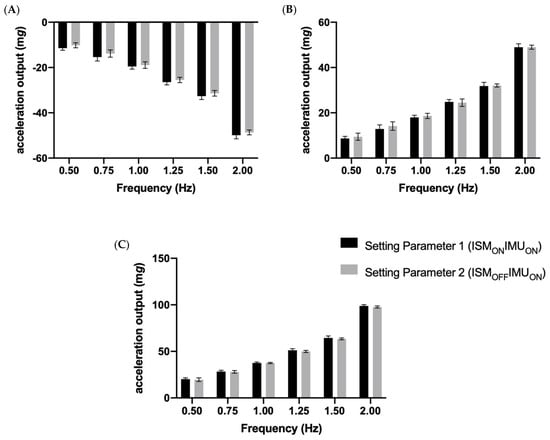 For the simple effect of the setting parameter, the statistical analyses revealed that the minimum, maximum and range of outputs were significantly different (p < 0.05) when measured using Setting Parameter 1 (ISMONIMUON) and Setting Parameter 2 (ISMOFFIMUON; Figure 4) at all of the tested frequencies. Similar to the X sensing axis, when measured using Setting Parameter 3 (ISMONIMUOFF), the dependent variables were not significantly different (p > 0.05) across the different frequencies.