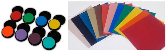 Eight colorimetric tiles certified by Labsphere® were considered as test samples, with the following colors: violet, purple, blue, cyan, green, yellow, orange, and red. Moreover, twelve samples of cloth fabrics with a palette of the most common colors were considered as test samples for a straightforward application in the textile industry. In fact, to optimize the use of pigments and their mixture, the textile industry frequently needs a quick color check during the dyeing process. In addition, fashion stylists like to communicate to the dying industry the colors they occasionally see, and a smartphone grabbing of the selected color then converted to chromatic coordinates by an app is a quick and effective method.