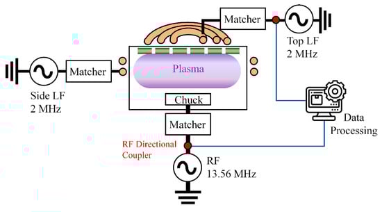 The plasma environment contributes to the variation in its parameters, such as capacitance, impedance, and potential, in the semiconductor fabrication process [31]. It affects the serial resonance of electrons in the bulk plasma and the sheath through electron dynamics, leading to the generation of the harmonics due to fast response and collective behavior of electrons. These harmonics are more easily diagnosed by the Fourier transforming the current waveform than by analyzing the voltage signal [19,25,30,32]. Therefore, for the plasma-related process, such as deposition or dry etching, changes in the plasma environment and surface reactions on the substrate can be identified by analyzing the harmonics [33,34,35]. Probe diagnosis is typically divided into two categories: invasive and noninvasive methods. Invasive methods involve physical contact with the plasma, such as with a Langmuir probe, which can limit its application [32,36,37,38]. Recently, noninvasive methods, such as directional coupler, have been studied and applied to investigate plasma processes [33,39,40,41]. These methods do not require physical contact with plasma and can provide information on harmonics without affecting plasma distribution.