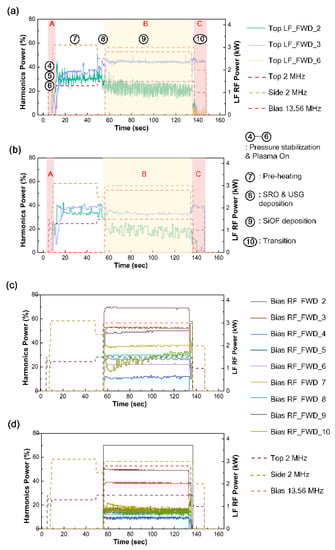 The process of depositing SiOF involves several steps, including pressure stabilization, plasma ignition, preheating, SRO and USG deposition, SiOF deposition, and a transition step. The behavior of the harmonics during SiOF deposition in Figure 3, where Figure 3a,b demonstrate the observed time-varying behavior of the LF power harmonics, while Figure 3c,d exhibit the same time-varying behavior of the RF power harmonics generated by the high-frequency RF power applied to the bottom electrode. Equation (1) expresses the harmonics as a power ratio, and then the 1st harmonic is not indicated in Figure 3. Since the power value of the fundamental frequency differs between forward and reverse power, the focus is on the change in trend of harmonics rather than on absolute comparison.