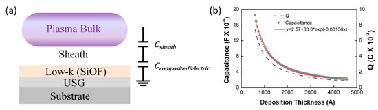 Figure 5b depicts the relationship between capacitance and electron charge (Q) as a function of increasing SiOF thickness. The low-k oxide is deposited to a thickness of 4000 Å on a 600 Å-thick USG, with a dielectric constant of 4.0, while the SiOF has a dielectric constant of 3.5 [50,51]. The substrate area is assumed to be the same as that of a 200 mm wafer. As the SiOF thickness increases, the capacitance and Q of the composite oxide exponentially decrease.