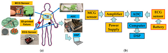 The recording system employed in this study is shown in Figure 1a and consists of MCG and ECG sensors, an Analog to Digital Converter (ADC), and a laptop computer for storing and processing the data. The block diagram of how these components were connected is shown in Figure 1b and further described next. We remark that the ECG data were collected as the “gold-standard” electric equivalent of MCG with a goal to validate the performance of the MCG sensor. In real-world scenarios, cardiac activity can be ultimately monitored directly from the MCG sensor itself without the need for a concurrent ECG recording. This is a unique aspect vs. our previous work where an ECG sensor had to accompany the MCG sensor for identifying the cardiac cycles to be averaged [17].