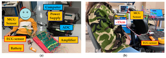(a) In vivo experimental setup employed in this study; (b) MCG confirmation test setup.