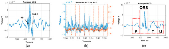 To confirm that detailed MCG features are indeed valid features and not artifacts, we superimposed the cycle-averaged ECG (red dashed line) on top of the cycle-averaged MCG (blue solid line) using the data obtained in the validation test (Figure 5a). Here, real-time R peaks (identified in MCGfinal per Section 2.3) are used as our trigger to identify repeating cardiac cycles for both ECG and MCG. As seen, only P-waves can be identified in the final cycle-averaged ECG signal as we are using a low-cost, off-the-shelf device. The location of this P-wave aligns with that of the MCG signal though, of course, and perfect alignment is not anticipated (note that the voltage induced is proportional to changes in the magnetic flux over time). Additional data regarding the time widths of QRS, PQ, and QT for all recruited subjects during the minimal movement study are included in Appendix A (Table A1) to further validate that the detected waveforms in all cases are indeed MCG. In the future, we expect that more extensive signal averaging and more advanced signal processing will further clear up the MCG signal, while clinical-grade ECG equipment will help demonstrate the correlation for other detailed features of the cardiac waveform (such as T and U waves).