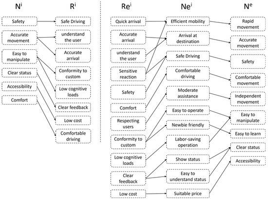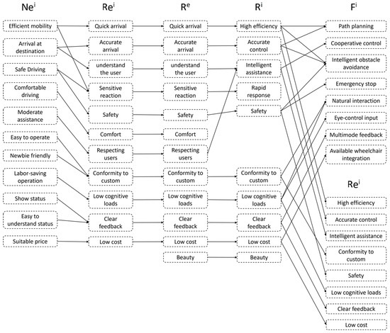 To avoid the drawbacks of a traditional user needs analysis relying solely on research interviews, this study employed the Extended FBS model to identify the results of literature research and user interviews. First, the external user needs Ni obtained from the research are transformed into Ri, which allows for the aggregation of needs by category. Second, Rei is transformed into Nei by fully considering the necessary requirements not mentioned by the user, and then further verifying with the user to confirm the expected requirements. The results of the need identification based on the Extended FBS model are illustrated in Figure 2.