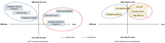 Finally, we have categorized these requirements into two levels: M-level requirements and S&M-level requirements, as illustrated in Table 4. S-level and C-level requirements were then determined with the assistance of the value–difficulty rule’s four quadrants, as shown in Figure 4. The final MosCow requirement prioritization was obtained, as displayed in Table 5. The Must Have requirements of the system include conformity to custom, safety, and clear feedback, which are essential in ensuring the safety and satisfaction of the users. Additionally, the Must Have functions include natural interaction and an emergency stop, which allow for intuitive and safe control of the wheelchair in various situations. On the other hand, the Should Have requirements include high efficiency, accurate control, and a low cost, which are necessary to ensure that the system is practical and accessible to a wide range of users. Correspondingly, the Should Have functions include available wheelchair integration, multimode feedback, and eye-control input. By meeting these requirements and functions, the developed system can provide a reliable and efficient solution for individuals with mobility limitations, improving their quality of life and independence.