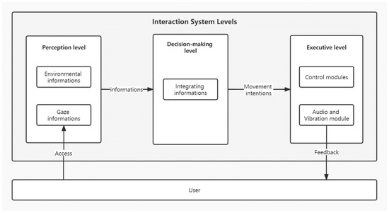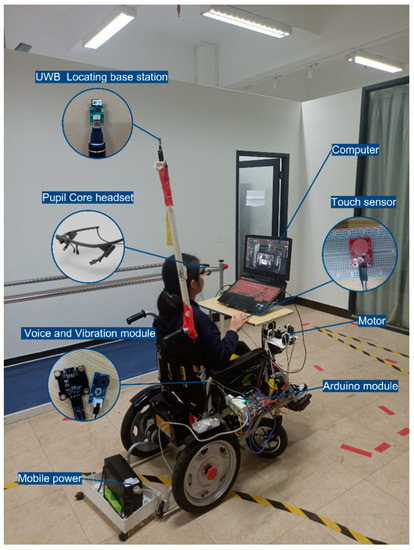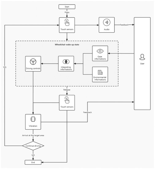According to the MosCow method, the M-Level requirements are conformity to custom, safety, and clear feedback. M-Level functions are natural interaction and an emergency stop. Natural interaction can use eye-control input to control the wheelchair, which is one of the functions of the S-level. Additionally, eye-control input through staring at the environment is not only consistent with the user’s driving habits, but also enhances user safety by avoiding distraction from computer interfaces. The emergency stop function allows the user to stop the wheelchair autonomously under any circumstances to avoid accidental collisions. Clear feedback can be achieved through multimodal feedback (an S-level function), and the status of the wheelchair can be fed back to the user in real time with the help of vibration and the voice. In addition, the requirements of the S-level also include high efficiency, accurate control, and a low cost, which means that the structure of the system must be simple and can be integrated into the available wheelchair (an S-level function) to reduce unnecessary costs and expenses. At the same time, the information transmission of each device should be efficient. Natural interaction, feedback, and efficiency can be evaluated utilizing the System Usability Scale (SUS). Meanwhile, factors such as efficiency, accurate control, and safety can be gauged through simulated driving experiments, considering metrics such as the driving time, average drift, and instances of a collision or other accidental situations. Additionally, user satisfaction can be measured using satisfaction scales, facilitating an assessment of conformity to user customs.