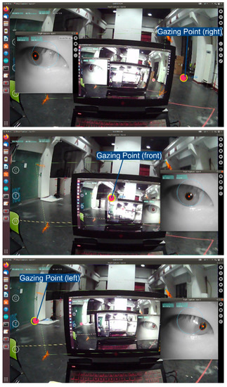 Eye-tracking wheelchair interaction systems using gaze control can be categorized into two types: gaze at the screen and gaze at the environment. Some researchers [17,21,22] have proposed systems that drive wheelchairs by gazing at a screen. In such systems, users can control the wheelchair by gazing at buttons or modules on a display, such as forward, left, right, back, and stop. Sunny et al. [23] developed a gaze control architecture for a wheelchair with a graphical user interface and a 6DoF robotic arm. The user can use the assisted robotic arm with the help of eye tracking and control the wheelchair to move by gazing at the wheelchair control interface on the graphical interface, which includes four buttons: forward, left, right, and backward. Although driving the wheelchair by looking at buttons on the display can increase the reliability of interpreting users’ intentions, there is a risk that users will need to shift their gaze from the environment to the display during use. Dahmani et al. [15] employed convolutional neural networks by inputting images of users’ eyes and processing them to determine the gaze direction to direct the wheelchair. However, this method uses two small cameras fixed to the frames of glasses to capture images of users’ eyes, with cameras facing users’ pupils, potentially causing discomfort. Ishizuka et al. [24] proposed a system based on gaze detection and environment recognition to enable movement in unknown environments by combining gaze information from eye tracking and obstacle information from LiDAR. However, the study’s experimental results primarily showed results related to turning, without elaborating on the overall movement effect.