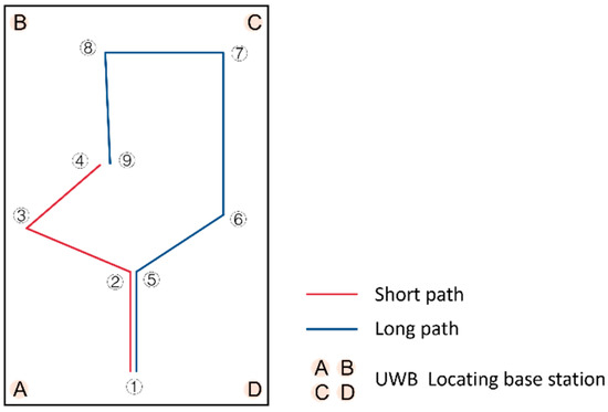 We consulted the publication by MacPhee et al. [36] for guidance on the arrangement of the experimental site. We selected an experimental site measuring 800 mm × 1215 mm. Based on daily driving needs, short and long experimental paths were planned and marked on the ground with red and yellow–black tape, including sharp, obtuse, and right-angle turns. While these two paths may not have covered all scenarios of wheelchair users’ daily travel activities, they represented common paths. The experimental site is shown in Figure 9, and the experimental site plan and planned paths are shown in Figure 10. The start and end points, along with the turning points, in the planned path are sequentially labeled with numbers to facilitate further discussion and analysis.