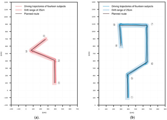 Driving trajectories of 14 subjects. (a) Short path driving trajectories of 14 subjects and (b) long path driving trajectory of 14 subjects.