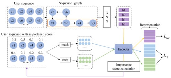 The sequential recommendation model GC4SRec proposed in this paper, with the structure shown in Figure 2, consists of two phases: the graph neural network-guided phase and the contrastive learning phase. In the graph neural network-guided phase, the model transforms the user sequence into a graph and then generates the importance score of each item in the sequence by learning contextual information about the user sequence through GNN. In the sequence contrastive learning phase, the model performs data augmentation methods according to the importance scores to generate positive views.