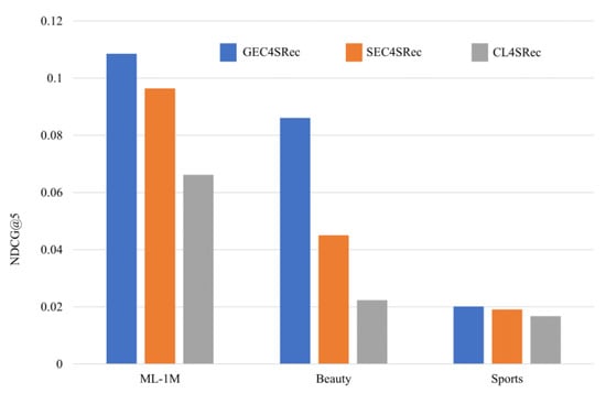 To verify the effect of the GC4SRec graph neural network bootstrap on model performance, SC4SRec uses the attention mechanism to generate importance scores. CL4SRec removes the process of generating importance scores from the graph neural network compared to GC4SRec. The results are shown in Figure 4.