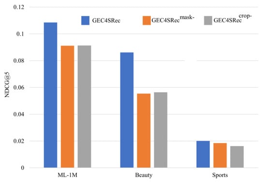 The common data augmentation methods for contrastive learning include mask and crop. To verify the impact of these two data augmentation methods on the model performance, experiments were conducted on three datasets with NDCG@5, and the experimental results are shown in Figure 5: