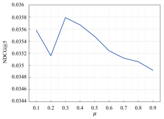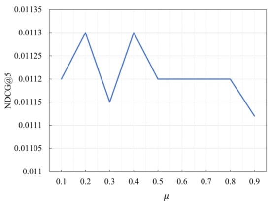 From the Figure 6 and Figure 7, it is clear the value of greatly affects the performance of the model. In the Beauty dataset, the optimal value of is 0.3. In the Sports dataset, the model’s performance is optimal when is 0.2. Therefore, different values should be used for different datasets to achieve optimal performance.