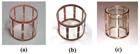 - Giovannetti, G.; Francesconi, R.; Landini, L.; Santarelli, M.F.; Positano, V.; Viti, V.; Benassi, A. Conductor Geometry and Capacitor Quality for Performance Optimization of Low-Frequency Birdcage Coils. Concepts Magn. Reson. Part B Magn. Reson. Eng. 2004, 20B, 9–16. [Google Scholar] [CrossRef]