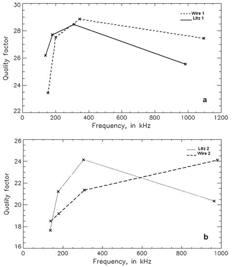 - Sullivan, C.R. Optimal Choice for Number of Strands in a Litz-Wire Transformer Winding. IEEE Trans. Power Electron. 1999, 14, 283–291. [Google Scholar] [CrossRef]